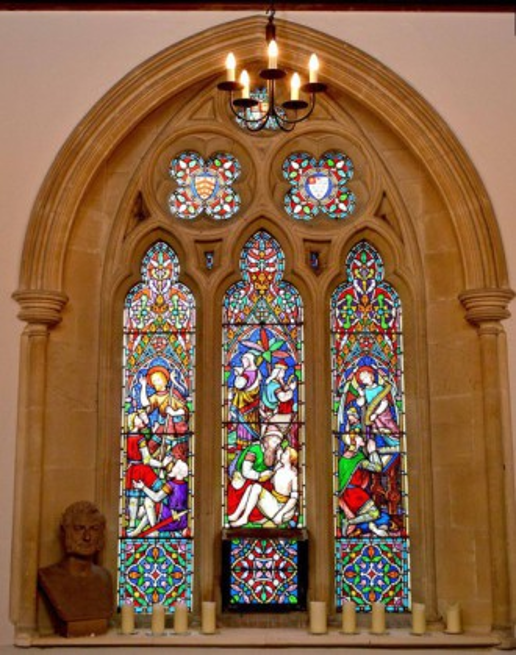 The north transept was used for pews by the Kingscote family for many years, probably after they were persuaded to give up their seats in the chancel, and is believed to have been built by them for that purpose in the first half of the 19th century. The transept has a fine panelled ceiling with tie beams springing from wall-posts which in turn lead down to eight corbels in the form of finely carved crowned heads. On the east wall is a beautifully carved oak panel dated 1639 which was almost certainly brought from the old manor house to adorn the family pew. The transept also contains busts of Thomas Henry Kingscote and Lord Raglan, the uncle of his first wife, who lost an arm at Waterloo and was the British Commander-in-Chief in the Crimea.